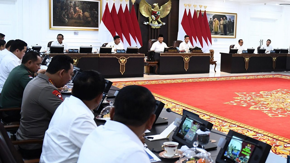 Presiden Prabowo Subianto memimpin rapat terbatas bersama sejumlah menteri Kabinet Merah Putih di Ruang Sidang Kabinet, Kantor Presiden Jakarta, pada Senin, 16 Desember 2024. Rapat tersebut membahas persiapan menjelang perayaan Natal 2024 dan Tahun Baru 2025.