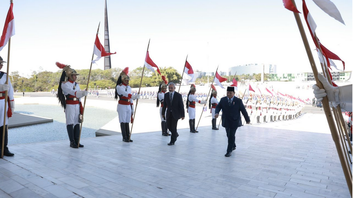 Setelah melaksanakan inspeksi pasukan Presiden Prabowo kemudian berjalan menuju pintu utama Istana Planalto, tempat Presiden Lula da Silva dan Ibu Negara Rosangela Lula da Silva telah menunggu.