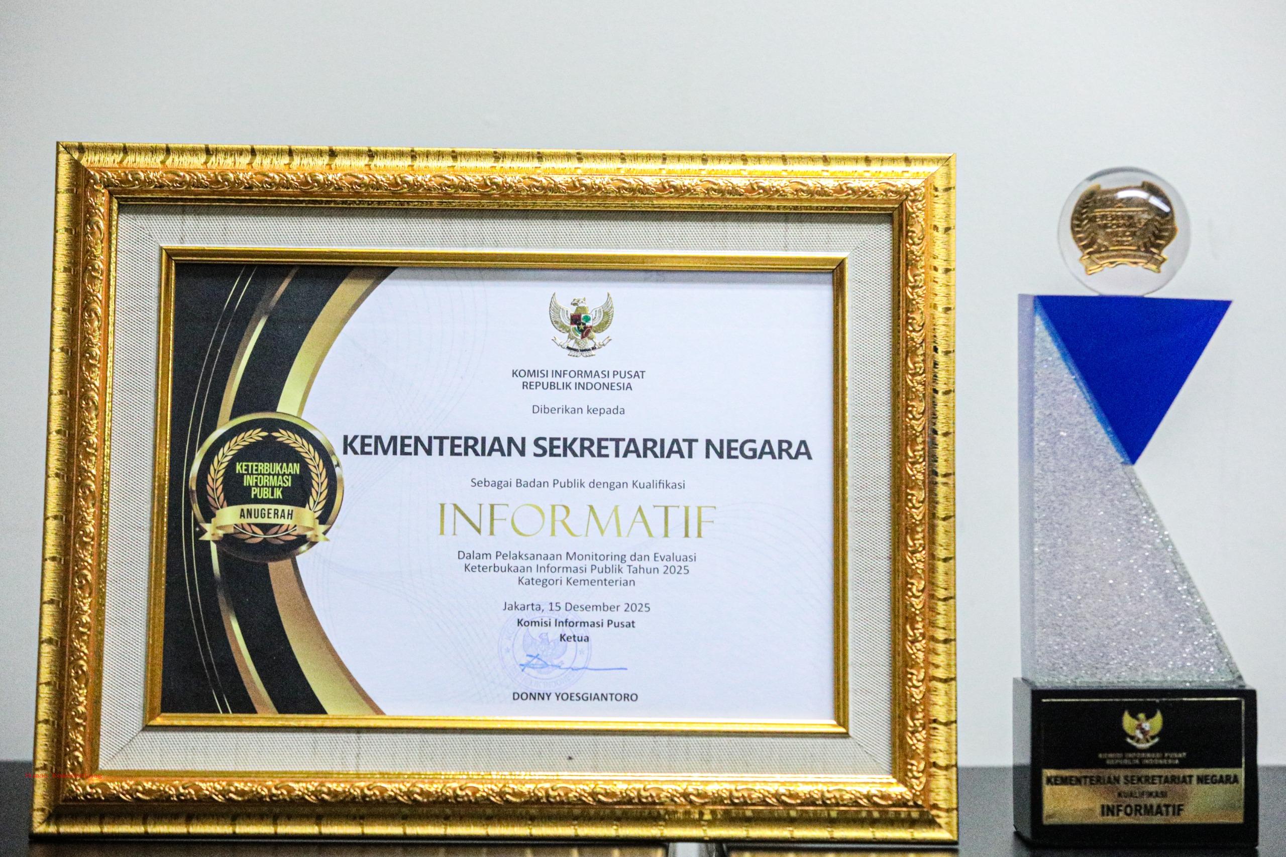 Kementerian Sekretariat Negara (Kemensetneg) meraih predikat “Badan Publik Informatif” dalam Anugerah Keterbukaan Informasi Publik Tahun 2025. Penghargaan tersebut diserahkan pada acara yang berlangsung di Gedung Bidakara, Jakarta, Senin (15/12/2025), dengan capaian nilai 94,39 untuk kategori kementerian.