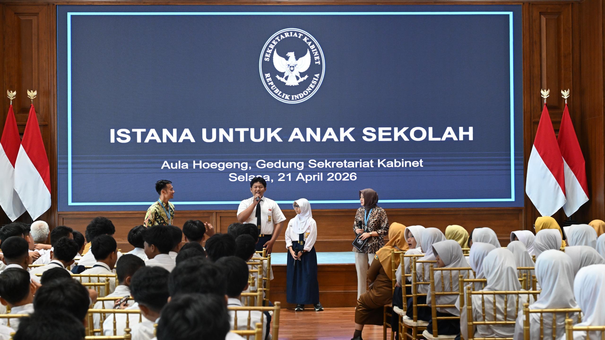 Kementerian Sekretariat Negara (Kemensetneg) melalui Sekretariat Dukungan Kabinet (Setdukab) menerima kunjungan pelajar, di Aula Hoegeng, Gedung Sekretariat Kabinet, Jakarta, Selasa (21/4/2026). Sebanyak 250 pelajar dari SMP Negeri 60 Jakarta mengikuti sesi pembelajaran di luar kelas dalam program Istana untuk Anak Sekolah.