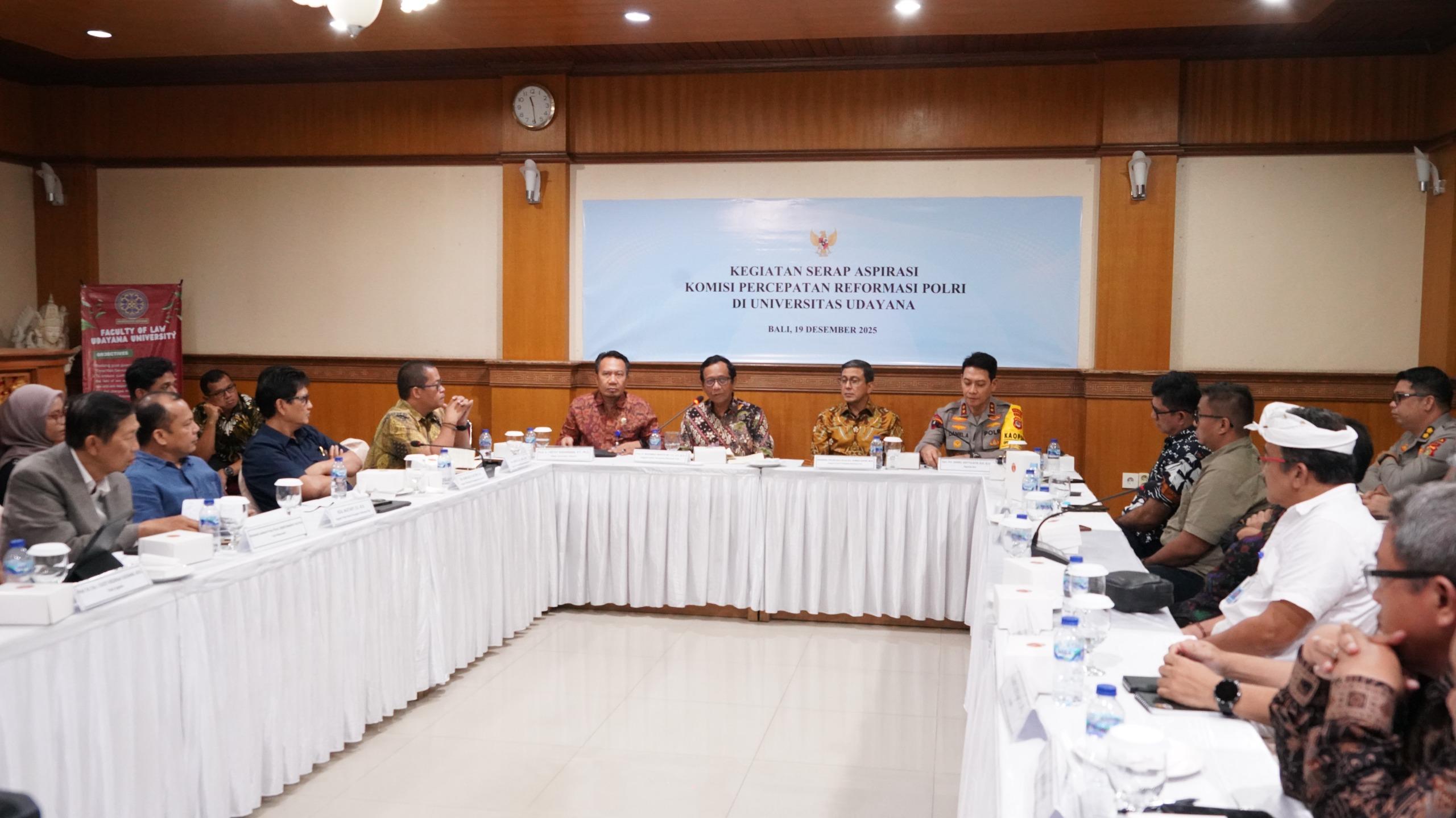 Dalam rangka melanjutkan serangkaian kegiatan penyerapan aspirasi terkait percepatan reformasi Kepolisian Republik Indonesia (Polri), Komisi Percepatan Reformasi Polri (KPRP) secara berkelanjutan terus menyediakan ruang bagi masyarakat untuk berpartisipasi dan memberikan dukungan terhadap transformasi Polri melalui public hearing yang digelar di berbagai daerah. Salah satunya, public hearing yang melibatkan perwakilan berbagai elemen masyarakat Bali di Universitas Udayana, Bali, pada Jumat (19/12/2025).