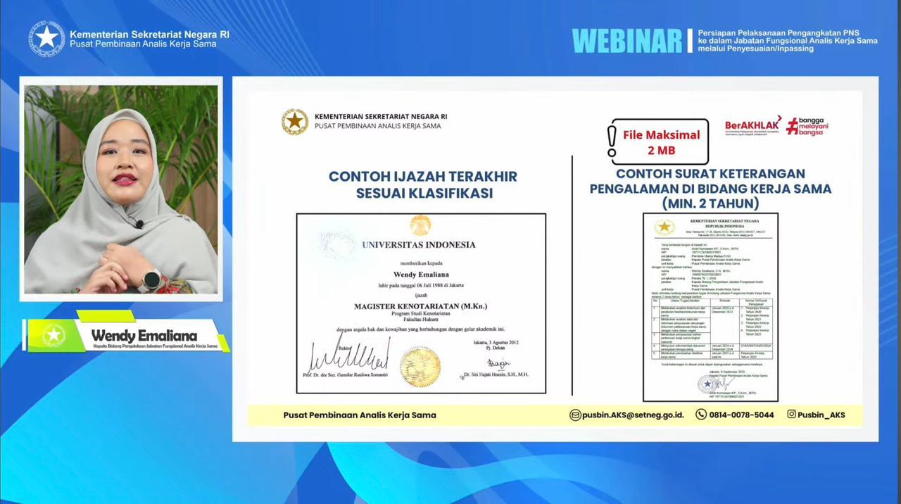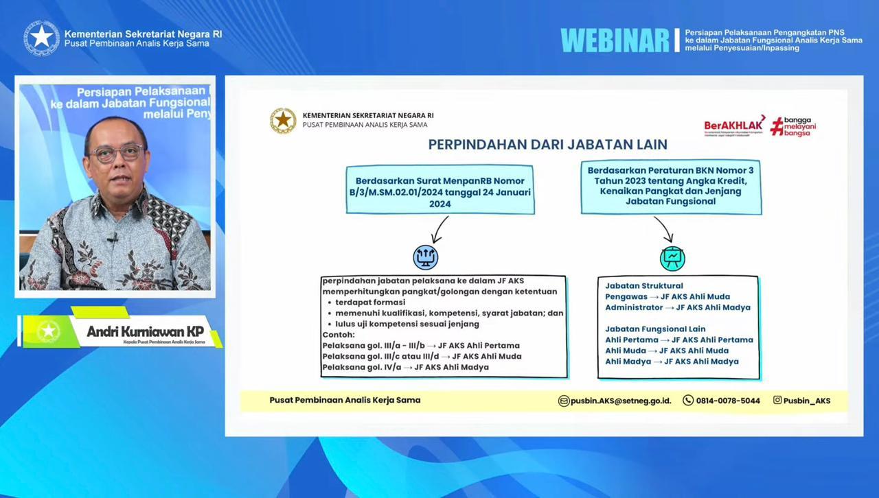 Kementerian Sekretariat Negara melalui Pusat Pembinaan Analis Kerja Sama (Pusbin AKS) menyelenggarakan Web Seminar (Webinar) Pelaksanaan Pengangkatan Pegawai Negeri Sipil (PNS) ke dalam Jabatan Fungsional Analis Kerja Sama (JF AKS) melalui Penyesuaian/Inpassing bagi aparatur sipil negara (ASN) di instansi pusat dan daerah. Kegiatan ini berlangsung secara daring pada Kamis (11/12/2025).